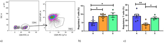 Regarding regulatory T cells, a gate strategy was reported in Figure 2a. Lower percentages of CD4+CD25+CD127−/low Treg were observed in the AR than in the BOS and Stable groups (Figure 2b).