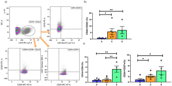 The analysis of the three main phenotypes of Bregs found that CD24hiCD38hi Bregs were lower in the AR than in the BOS and Stable groups (Figure 5b). No significant differences in the expression of CD24hiCD27hi and CD5+CD1d+ were observed among the three groups.