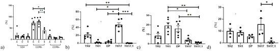 In the BOS group, analysis of Th cells showed higher percentages of Th1 cells than Th17 and Th17.1 cells. In the BOS group a difference was also observed between the abundance of double-positive and Th17.1 cells (Figure 6c).