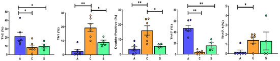 Th2 and Th17 cells were significantly higher in the AR than in the other two groups, whereas we found a predominance of Th1 and double positive cells in the BOS group. Interestingly, Th17.1 cells differed in percentage between the BOS and AR groups (Figure 7).