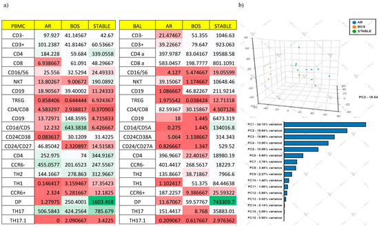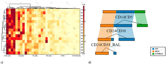 PCA plots showing effect for each sample on cellular variation in these three conditions: AR, (n = 6) BOS (n = 6) and Stable (n = 4). The first PC and second PC resolved 24.15% and 18.64% of the total variance, respectively (Figure 9b). The heat map is based on hierarchical clustering applied for row and columns and reported as Euclidean distance. The color of the heat varies from white indicating relative under-representation to red indicating relative over-representation. Clusters are sorted according to adjusted p values, so that the cluster at the top shows the most significant abundance changes between the three conditions (Figure 9c).