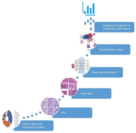 In the setting of Personalized Medicine (PM) a biomarker is every piece of information used to recognize a specific subset of a larger population with diagnostic, prognostic and/or predictive purposes. Tissue biomarkers are information written in the tissue, which can be interpreted by properly only by Pathology. Histotype, Grade and Stage of malignant tumors are “classic” tissue biomarkers: recognizing patients affected by early stage disease and with specific favorable histotype, represent the origin of PM. Estrogen and progesterone receptors, Ki67 and HER2/neu, aka the biological profile of breast cancer, were the first examples, in the 2000s, of “new” tissue biomarkers: the expression of these phenotypical indicators allowed to select properly medical treatment and predict outcome of patients affected by breast cancer. In the last two decades, several other biomarkers have been discovered at different deepness (cellular, subcellular, molecular) in distinctive cancer population (neoplastic cells, cancer-associated immune cells, etc.). The increasing number of tissue biomarkers and the complexity of their evaluations, strongly encourages the use of AI based tools in the process of evaluation, to reinforce the role of Pathology in PM. [8]. Moreover, AI algorithms have been used to discover information which are ignored by human review of an H/E image and use them to make specific prediction as shown in Figure 1. These AI-based biomarkers include the prediction of treatment response [9,10], somatic mutations [11], or patient survival [12,13]. In the following sections, we will present how AI has been used to support tissue biomarkers evaluation in specific field of Pathology; also, we will give an insight to the intriguing field of AI-based biomarkers.