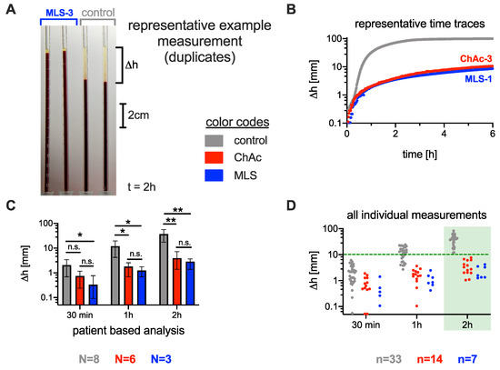Comparison of the erythrocyte sedimentation rate (ESR) between neuroacanthocytosis patients and healthy controls. (A): ESR measurement setup: Standard Westergren tubes were filled with full blood and left to rest. The sedimentation height was measured over time. The picture was taken after 2 h. The first two tubes contain blood from an MLS patient, and the last two tubes contain blood from a healthy control donor. (B): Representative time traces of the sedimentation height for the different conditions. (C): Statistics on sedimentation height after typical times for healthy controls, chorea-acanthocytosis (ChAc) patients, and McLeod syndrome (MLS) patients. The bar height represents the average value, and the error bar depicts the range of individual values. Stars indicate the significance levels (Brown–Forsythe and Welch analysis of variance (ANOVA) test): n.s., not significant (p-value > 0.05); * p < 0.05; and ** p < 0.01. N refers to the number of patients. (D): Span of all individual sedimentation height measurements (each blood sample was measured at least in duplicate, and the blood of some patients was measured at different time points). After 2 h, a of 10 mm could be regarded as a threshold to differentiate the ChAc and MLS conditions. The number n refers to the number of individual measurements out of the same number N of patients.
