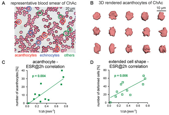 We observed that the ESR tends to decrease when the fraction of acanthocytes increases. To relate the ESR to the number of acanthocytes, the inverse of the ESR at 2 h was plotted as a function of the number of acanthocytes (Figure 2C). In a more general approach, we plotted the inverse of the ESR at 2 h against the number of all deformed cells (echinocytes, acanthocytes, and others; Figure 2D). The analysis revealed a significant correlation for both parameters ( coefficient of 0.61 (acanthocytes) and 0.59 (all deformed cells), p-values of 0.004 and 0.006, respectively).