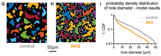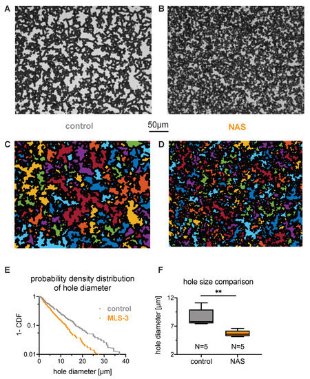 To experimentally estimate the hole size, we allowed the erythrocytes to settle in a microscope chamber such that the final hematocrit on the coverslip layer was close to the physiological value of 45% (Figure 3A,B). This, when observing the chamber from the bottom, allowed a two-dimensional analysis of the hole size H based on microscopy images, as outlined in Figure 3C–E. The quantitative difference in average hole diameter (defined as the square root of the average hole area) is exemplified for one healthy control and one NAS patient by a probability density distribution (Figure 3E). A statistical analysis of the hole diameters is given in Figure 3F, revealing a larger hole size for the blood of healthy donors. One can also note that the total area covered by the erythrocytes is different between healthy controls and NAS patients (e.g., in Figure 3A–D, the total area of the holes is 8.5 under control conditions, but 6.2 for the patients). This was caused by the projection area of the cells despite the absolute hematocrit being equal between the groups. Under control conditions, almost all cells form rouleaux and, hence, contribute to a side projection, while acanthocytes and echinocytes have a larger projection area.