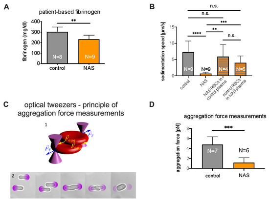 Measurements related to the role of plasma in sedimentation. (A): Comparison of fibrinogen concentrations. A significant difference consistent with the aggregation force difference was observed. (B): Comparison of sedimentation velocities of control samples, NAS patient samples, and samples with erythrocytes and plasma exchanged. (C) 1: Schematic of the forces acting on the erythrocytes trapped in optical tweezers. (C) 2: Microphotographs of the protocol for the measurement of the aggregating force. The purple circles show the locations of external optical traps. From left to right: After being selected, erythorcytes were lifted 15 m from the microscope slide by four optical traps, one for each erythrocyte extremity. The optical traps had known trapping forces. The erythrocytes were then brought into contact. At equilibrium, the two inner traps were removed. The optical force holding the cells was decreased stepwise, and the overlap distance tended to increase in the same manner. Finally, spontaneous aggregation overcame the optical forces, and the erythrocytes escaped the trap. The trapping force at which the cells aggregated was considered to be the aggregation force. (D): Comparison of aggregation forces. A significant difference between patients and controls was observed. n.s., not significant (p > 0.05); ** p < 0.01; *** p < 0.001; and **** p < 0.0001.