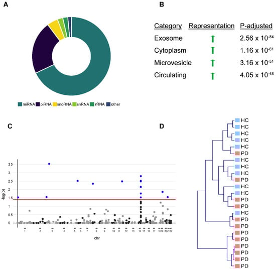 Differential expression of miRNAs in serum-derived exosomes of Parkinson‘s disease (PD) patients vs. healthy controls (HC). (A) Donut chart showing different non-coding RNA (ncRNA) species detected in serum-derived exosomes with the majority being miRNAs. (B) Functional characterization of detected miRNAs using exRNA forms (miRandola) categorization shows very strong overrepresentation of exosome, microvesicle, and circulation-associated categories. (C) Shows hierarchical clustering of PD patients and HC based on differential miRNA representation of exosomes with many outliers. An adequate separation between PD patients and HC is not possible. (D) Manhattan plot shows differential miRNA expression for every miRNA based on chromosome coordinates. Every plot represents a single miRNA. Blue-filled dots represent miRNAs with an FDR < 0.05. Red line represents a significance level of FDR < 0.05.