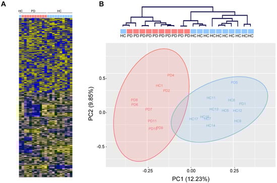 Analysis of circulating miRNAs in serum of patients with Parkinson‘s disease (PD) and healthy controls (HC). (A) MiRNA expression measured with miRNA arrays show distinct miRNA expression patterns in PD patients (red) and healthy controls (blue). (B) Unsupervised hierarchical clustering (top) and principal component analysis (PCA, bottom) show robust separation of PD patients from healthy controls (n = 11/10 HC/PD).