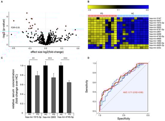 Differential expression of miRNAs in serum of Parkinson‘s disease (PD) patients versus healthy controls (HC). (A) Volcano plot showing negative logarithmic p-values versus effect size of differential miRNA expression in PD over healthy controls. Every dot represents a single miRNA (n = 1729), red filled dots represent miRNAs with an FDR < 0.05. Dotted horizontal line represents an FDR < 0.05. (B) Heatmap visualization of the expression of the 14 significantly altered miRNAs with an FDR < 0.05 (row z-score). (C) Validation of altered miRNA expression of top three differentially abundant miRNAs by RT-qPCR in an independent cohort from three different centers (n = 60/60 HC/PD, mean +/− SEM, ** p < 0.01, *** p < 0.001). (D) ROC plot showing diagnostic sensitivity and specificity to predict the disease status (PD) for different cutoffs. Grey represents hsa-mir-3665, light blue represents hsa-mir-1915-3p, and dark blue represents hsa-mir-4745-5p. The red line represents a logistic regression model based on all three miRNAs combined AUC (0.95 CI).