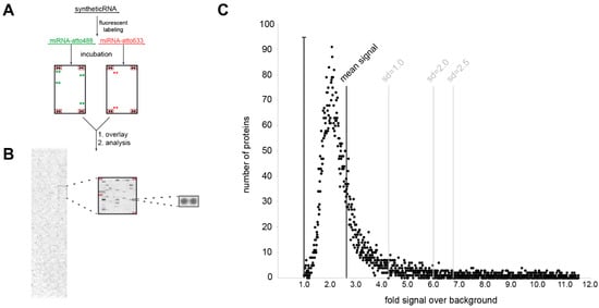 Next, we aimed to identify protein-binding partners of dysregulated miRNAs in PD. To this end, we performed a large-scale analysis of potential binding partners of the serum miRNA with the largest difference between PD patients and healthy controls hsa-mir-4745-5p (fold change HC vs. PD = 3.9) by incubation on protein microarrays. To distinguish between disease-specific and non-disease-related unspecific miRNA-protein binding, human protein microarrays were probed in parallel with the non-PD-regulated miRNA hsa-mir-92a-3p (q > 0.96, fold change HC vs. PD = 0.86) and with cel-mir-39-3p of non-human origin. The schematic workflow of this approach is depicted in Figure 4A,B. Briefly, miRNAs were synthesized, labeled with a fluorescent dye (atto488 or atto633), probed on human protein microarrays containing 9125 proteins, and scanned on a laser scanner. Laser scanning and digital image analysis showed many proteins (2–5%) with a signal intensity ratio over 1 (background), suggesting that global nonspecific fluorescence is not a major concern (Figure 4C).