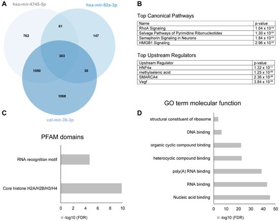 (A) Venn diagram of numbers of miRNA binding partners of hsa-mir-4745-5p (top regulated miRNA in PD serum), hsa-mir-92a-3p (not regulated in PD), and cel-mir-39-3p (nonhuman controls from C. elegans). (B) Top canonical pathways and upstream regulators of the significant protein binding partners unique for hsa-mir-4745-5p (n = 762) using ingenuity pathway analysis. (C,D) show top PFAM-domains and Gene Ontology (GO) term molecular functions of the significant protein binding partners unique for hsa-mir-4745-5p (n = 762).