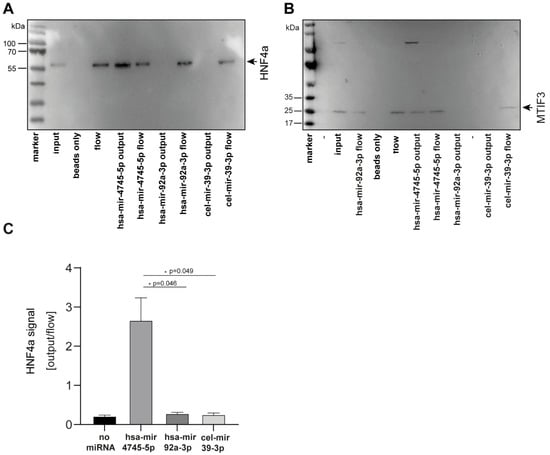To perform biochemical validation of these findings, we selected the top two candidates of the newly-identified unique hsa-mir-4745-5p interaction partners and studied miRNA protein interaction by pull-down experiments (Figure 6). First, MTIF3, which was identified as the protein-binding partner of hsa-mir-4745-5p with the highest Z-factor (0.911) in the protein microarray approach, was studied. Using biotin-labeled-hsa-mir-4745-5p, MTIF3 was pulled down from full-cell lysate, whereas the biotin-labeled-controls hsa-mir-92a-3p and cel-mir-39-3p did not pull down MTIF3, thus confirming the novel hsa-mir4745-3p-MTIF3 interaction (Figure 6A). Furthermore, pull-down verified a specific interaction between HNF4a (second-highest Z-factor) and hsa-mir-4745-5p (Figure 6B,C). Hsa-mir-92a-3p and cel-mir-39-3p did not interact with HNF4a, proving specific hsa-mir-4745-5p and HNF4a interaction.