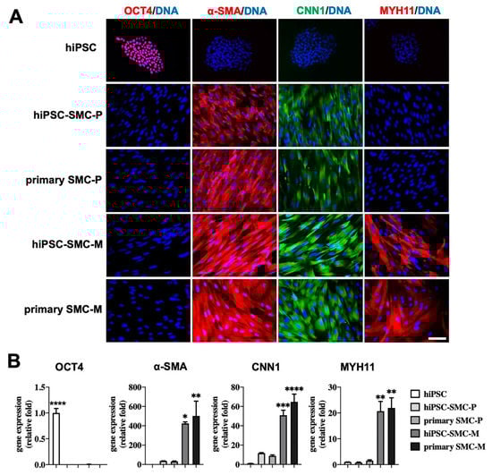 Characterization of hiPSC-SMC. (A) Immunofluorescence of the pluripotency marker OCT4 and the SMC-specific markers α-SMA, calponin 1 (CNN1) and smooth muscle myosin heavy chain 11 (MYH11) in hiPSC, proliferative hiPSC-SMC (hiPSC-SMC-P), proliferative primary human SMC (primary SMC-P), mature hiPSC-SMC (hiPSC-SMC-M), and mature human SMC (primary SMC-M). Scale bar, 200 μm. (B) Bar graphs show qPCR analysis of relative transcript numbers of OCT4 and SMC-specific marker genes in hiPSC, hiPSC-SMC-P, primary SMC-P, hiPSC-SMC-M, and primary SMC-M. Values on the y-axis represent fold changes relative to number of human GAPDH transcripts; gene expression is relative to that in hiPSC (ANOVA with Tukey’s multiple comparisons test); n = 3. * p < 0.05; ** p < 0.01; *** p < 0.001; **** p < 0.0001.