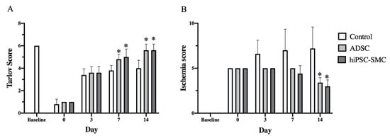 hiPSC-SMC improve postoperative functional scores. (A) Bar graph shows the Tarlov score in mice treated with control, ADSC or hiPSC-SMC (two-way ANOVA, p < 0.05; n = 5, * p < 0.05 (post-hoc)). (B) Bar graph shows the Faber ischemia score in mice treat with control, ADSC or hiPSC-SMC (two-way ANOVA, p < 0.01; n = 5, * p < 0.05 (post-hoc)).