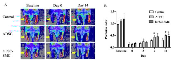 To determine whether hiPSC-SMC ameliorate ischemia, we injected hiPSC-SMC intramuscularly into the ischemic limbs of nude mice at two sites (distal and proximal) in both the adductor muscle and the gastrocnemius muscle, and PBS alone was injected as a negative control. Human ADSC were also used as a positive control since they have the potential to increase angiogenesis [32], and we have previously shown their ability to achieve wound healing in nude mice [18]. Both hiPSC-SMC- and ADSC-treated mice showed improved functional outcomes compared with control-treated mice, with increased Tarlov scores at day 7 and day 14 (p < 0.05, Figure 2A), as well as decreased Faber ischemia scores at day 14 (p < 0.05, Figure 2B). Laser Doppler images showed improved perfusion in hiPSC-SMC- and ADSC-treated mice compared with control mice at day 14 (hiPSC, 47.4 ± 3.7%, p = 0.054; ADSC, 50.2. ± 2.0%, p = 0.002; Figure 3 and Figure A2).
