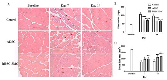 hiPSC-SMC improve gastrocnemius muscle histology. (A) Representative photomicrographs showing histology gastrocnemius muscle of mice treated with PBS, ADSC or hiPSC-SMC on days 0, 7 or 14. Red arrows show ischemic myocytes with plump and centralized nuclei. Hematoxylin and eosin stain; 40× magnification. (B) Bar graph of muscle fiber number (two-way ANOVA, p < 0.0001; n = 5, **** p < 0.0001 (post-hoc)). (C) Bar graph of muscle fiber area (two-way ANOVA, p = 0.0001; n = 5, * p < 0.05, ** p < 0.01, *** p < 0.001, **** p < 0.0001 (post-hoc)).