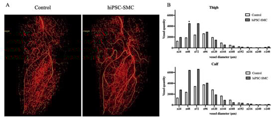 hiPSC-SMC increase angiogenesis. (A) Representative microCT images of a mouse leg treated with control (left panel) or hiPSC-SMC (right panel), day 14. (B) Representative data showing vessel quantity in the thigh (upper graph) or calf (lower graph), day 14 (Student’s t-test, * p < 0.05; n = 2).