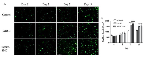 hiPSC-SMC increase capillary density in gastrocnemius muscle. (A) Representative immunofluorescence of isolectin B4 in gastrocnemius muscle in mice treated with control, ADSC or hiPSC-SMC on days 0, 3, 7 or 14. (B) Bar graph of capillary density (two-way ANOVA, p < 0.0001; n = 5, ** p < 0.01, **** p < 0.0001 (post-hoc)).