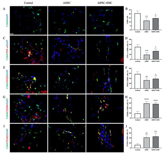 Next, we determined the numbers of macrophages as well as the macrophage phenotype that was associated with each treatment group. Both hiPSC-SMC and ADSC treatments were associated with decreased numbers of CD68-positive cells compared with the control treatment (hiPSC-SMC, 14.6 ± 1.3, p < 0.05; ADSC, 11.6 ± 1.6, p < 0.01; day 3; Figure 7A,B), consistent with fewer macrophages. There were fewer numbers of CD68/TNFα dual-positive cells (hiPSC-SMC, 33.4 ± 3.9%, p < 0.05; ADSC, 18.8 ± 3.8%, p < 0.001; Figure 7C,D) as well as CD68/iNOS dual-positive cells (hiPSC-SMC, 38.7 ± 5.5%, p < 0.05; ADSC, 33.0 ± 4.2%, p < 0.01; Figure 7E,F) in ischemic limbs treated with hiPSC-SMC or ADSC compared with control treatment, suggesting fewer M1-type macrophages. However, there were increased numbers of CD68/CD206 dual-positive cells (hiPSC-SMC, 56.3 ± 3.1%, p < 0.0001; ADSC, 58.4 ± 3.3%, p < 0.0001; Figure 7G,H) as well as CD68/TGM2 dual-positive cells (hiPSC-SMC, 45.9 ± 6.3%, p < 0.01; ADSC, 41.6 ± 5.6%, p < 0.01; Figure 7I,J) in limbs treated with hiPSC-SMC or ADSC compared with control treatment, consistent with increased numbers of M2-type macrophages. M2-type macrophages were mainly distributed between muscle bundles and in intermuscular spaces. These data suggest that treatment of ischemic limbs with hiPSC-SMC is associated with fewer macrophages, decreased numbers of M1-type macrophages, and increased numbers of M2-type macrophages.
