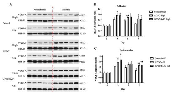 Next, we determined whether expression of VEGF-A was a potential mechanism of increased angiogenesis in hiPSC-SMC-treated mice (Figure 5 and Figure 6). VEGF-A expression was significantly elevated in both the adductor muscle and the gastrocnemius muscle of ischemic limbs in both hiPSC-SMC- and ADSC-treated mice compared with control treatment (day 3, p < 0.05; Figure 8A,C). VEGF-A expression was maximal at day 3 and then gradually decreased in all three groups (Figure 8 and Figure A3).