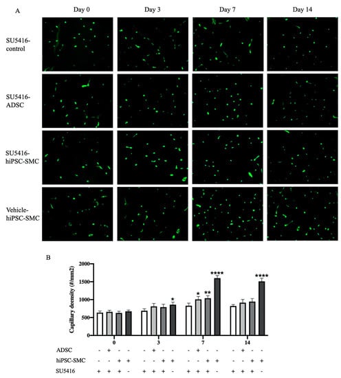 To determine whether immunoreactive VEGF-A was functional and thus could be a mechanism of the angiogenic potential of hiPSC-SMC, SU5416, a potent and selective inhibitor of the VEGF receptor 2 tyrosine kinase, or vehicle control were injected daily intraperitoneally. The positive control group mice treated with both hiPSC-SMC and vehicle control showed increased angiogenesis, as expected; compared with this group, there was lower capillary density in hiPSC-SMC-treated mice also administered with SU5416 (day 14, p < 0.0001; Figure 9). ADSC-treated mice similarly administered with SU5416 also showed diminished capillary density (p < 0.05; Figure 9). These data suggest that increased VEGF-A expression is a mechanism by which hiPSC-SMC improve angiogenesis.