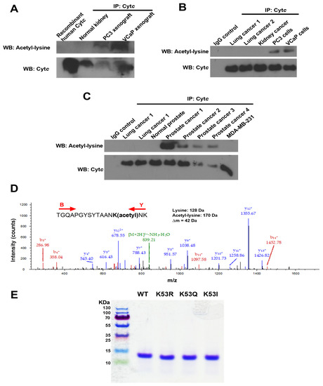 However, Cytc is located in the IMS with a more acidic pH compared to the matrix. Strikingly, K53 was consistently acetylated in all 8 prostate cancer xenograft samples subjected to mass spectrometry analysis, making it a highly specific modification. Cytc immunoprecipitated from prostate cancer and prostate cancer cell lines was also acetylated, whereas Cytc from normal prostate, lung cancer, normal and kidney cancer tissues, and a breast cancer cell line was not acetylated. It should also be noted that phosphorylations, which we have reported in healthy tissues and have been shown to regulate the multiple functions of the protein [9,10,11,12,13,43,44,45,46,47,48], were not detected in any of the prostate tumor xenografts. This indicates a dichotomy between signaling pathways in normal and transformed cells that target Cytc. Additionally, K53 of Cytc is conserved across all mammals [29], pointing to a central regulatory site.