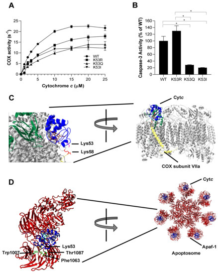 (A) Oxygen consumption rate was measured in the presence of 30 nM of bovine liver COX using an Oxygraph system. WT, K53R, K53Q, and K53I Cytc variants were titrated at concentrations of 0, 1, 2, 3, 5, 10, 15, 20, and 25 µM (n = 3). Data are represented as means±SEM. (B) Cytosolic extracts of HeLa cells were incubated with recombinant WT, K53R, K53Q, and K53I variants for 2.5 h at 37 °C. Fluorescence that resulted from caspase-3 mediated cleavage of the rhodamine substrate DEVD-R110 was used as a measure of caspase-3 activity (n = 3). Data are represented as means ± SEM, * p < 0.05. (C) Docking model of COX and Cytc [32] showing the interaction of Lys53 residue of Cytc with Lys58 residue of COX subunit VIIa within 5 Å. (D) Cytc Lys53 interaction with Apaf-1 represented on the human apoptosome structure [33]. Apaf-1 residues Phe1063 (within 5 Å) and Trp1007 and Thr1087 (within 6 Å) are in close proximity to Lys53 residue.