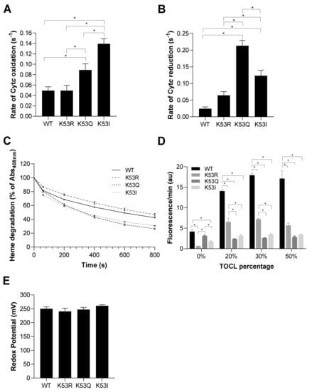 Cytc can lose its functionality at very high ROS concentrations. To test its stability, we measured degradation of the heme catalytic site of Cytc upon addition of a high concentration (3 mM) of H2O2. Dissipation of the Soret peak of Cytc at 408 nm is characteristic of heme degradation. K53Q replacement resulted in the highest heme degradation of 73.8% at 800 s compared to WT, K53R, and K53I that resulted in a heme degradation of 57.6%, 53.3%, and 69.3%, respectively (Figure 3C). Cardiolipin is a mitochondria-specific phospholipid which interacts with Cytc. The peroxidase activity of Cytc is activated in the presence of H2O2, resulting in cardiolipin peroxidation. If this reaction happens on the outer mitochondrial membrane, Cytc can be released from the mitochondria leading to activation of apoptosis [3,4]. Cardiolipin peroxidase activity of Cytc variants was analyzed by their efficiency in oxidizing cardiolipin, which in turn oxidizes Amplex red to resorufin. Interestingly, cardiolipin peroxidase activity of acetylmimetic K53Q and nonpolar K53I Cytc mutants were significantly reduced, by between 78% and 86%, compared to WT Cytc at TOCL percentages of 20%, 30%, and 50% (Figure 3D). These findings align with caspase-3 activity data, further supporting an anti-apoptotic role for K53 acetylation. Finally, for proper functioning of Cytc as an electron carrier, the redox potential of Cytc should be between the redox potentials of complexes III and IV. In the literature, the mammalian Cytc redox potentials are in the range of 220–270 mV [24,37]. The midpoint redox potential (E0′) of K53 Cytc variants was measured spectrophotometrically. The redox potentials of the Cytc variants were similar, 250 mV, 241 mV, 247 mV, and 261 mV for WT, K53R, K53Q, and K53I Cytc, respectively (Figure 3E), suggesting that modification of K53 does not have a major effect on the heme moiety.