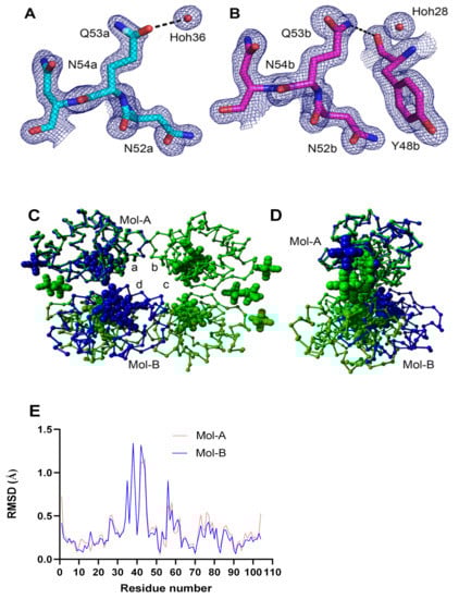 (A,B) The comparison of the “omit” density for K53Q in the two Cytc molecules in the asymmetric unit of the crystal structure. (C,D) The structure of the K53Q Cytc crystallographic dimer is superposed onto the native rodent Cytc (5C0Z.pdb) crystallographic tetramer using chain-A in both structures. (E) C-alpha atom RMSD plots of K53Q Mol-A and Mol-B relative to Mol-A in the WT structure (5C0Z.pdb).