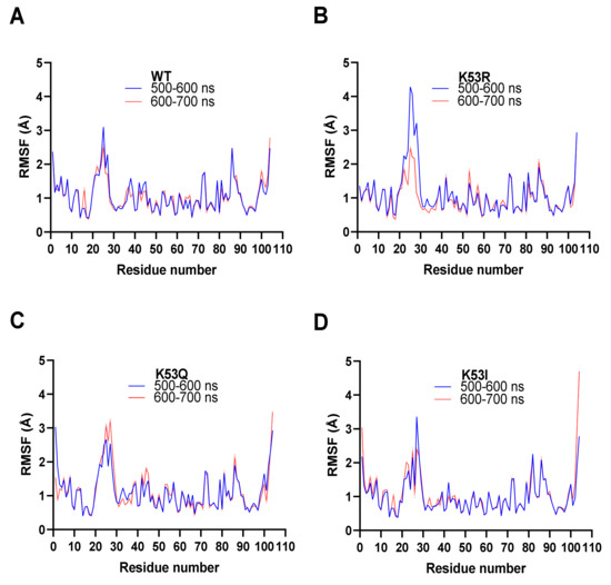 Molecular dynamics simulations. All four simulation averages were calculated for the 500–600 ns (blue) and 600–700 ns (red) intervals. The average RMSF (Å) for all atoms in each residue in the amino acid chains are shown. All four runs displayed equilibrium within 500 ns to 700 ns. (A) Molecule A from the WT Cytc crystal structure (PDB entry 5C0Z). (B) Equivalent to (A) for K53R Cytc. (C) Equivalent to (A) for K53Q Cytc. (D) Equivalent to (A) for K53I Cytc.
