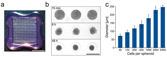 For use in 3D bioprinting, the generation of spheroids on a large-scale and in uniform size and shape is required. For this purpose, the spheroids were formed in agarose-based micromolds (Figure 1a), allowing for the fabrication of 256 spheroids per well, i.e., a total of 3072 spheroids per 12-well plate. Spheroids formed within 48 h in a highly controlled manner with a regular round shape and reproducible size (Figure 1b). The size of the microtissues was easily adjustable by using different seeding densities (Figure 1c). Spheroids with 2500 cells and a diameter of 228 µm (± 22 µm) were routinely used in the following printing experiments.
