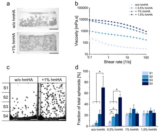 Modification of hyaluronic acid (HA) hydrogel formulation to ensure homogeneous spheroid distribution. (a) Representative images of printed gels without and with the addition of 1 wt% high molecular hyaluronic acid (hmHA). Scale bars represent 1000 µm. (b) Shear viscosity of the different hydrogel formulations without and with the addition of hmHA. Data are presented as mean ± standard deviation (n = 4). (c) Analysis of sedimentation behavior of human adipose-derived stromal cell (ASC) spheroids in non-crosslinked HA–SH hydrogel formulations without and with 1 wt% unmodified hmHA after 30 min. Images were divided into 4 sectors for further analysis (S1–S4). Scale bars represent 1000 µm. (d) Fraction of spheroids in sectors S1–S4 after 30 min in different gel formulations (without and with 0.5, 1 and 1.5 wt% hmHA). Data are presented as mean ± standard deviation (n = 3). Statistically significant differences are indicated by * (p < 0.05).