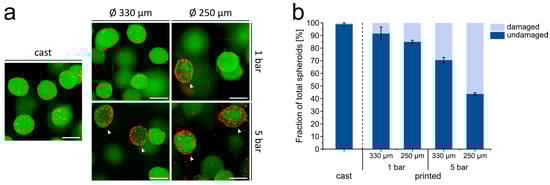 When printed with a nozzle with 330 µm inner diameter and 1 bar pressure, the percentage of spheroids with a noticeable fraction of dead cells at the outer, surface-exposed cell layer (in the following referred to as damaged spheroids) was 9%, in comparison to 1% for spheroids in the cast samples (Figure 3). With higher printing pressure (5 bar) and lower nozzle diameter (250 µm), the percentage of damaged spheroids increased dramatically up to 56% and large numbers of dead cells were observed at the outer region of the spheroids (Figure 3a,b). High pressure also led to abrasion of dead cells from the spheroid surface and their distribution in the surrounding gel, whereas cells in the spheroid core seemed to be more protected against these shear forces (Figure 3a). In all subsequent experiments, the printing of the ASC spheroids was done through a 330 µm nozzle at a pressure of 1 bar.