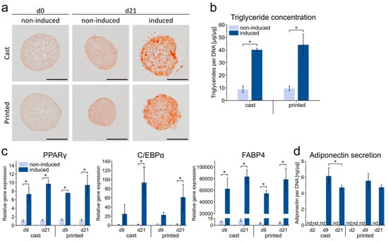 Gene expression analysis of PPARγ and C/EBPα, master regulators of early adipogenesis, as well as fatty acid-binding protein 4 (FABP4) as a late marker of adipogenic differentiation, also revealed no significant differences between the print and cast condition for all genes and time points analyzed (Figure 4c). Compared to non-induced controls, PPARγ and FABP4 displayed strongly elevated expression levels at d9 and d21 upon induction; for C/EBPα, increases in gene expression were significant at d21. In addition, secretion of adiponectin, a major adipokine, was examined by ELISA (Figure 4d). Adiponectin was not detectable in the supernatants of non-induced samples, whereas a marked increase in the secretion was observed in the induced samples at later stages of differentiation. Again, no significant differences were found in the secretion behavior between print and cast conditions at the respective time points. Taken together, ASC spheroids in the printed HA gel were demonstrated to be able to undergo substantial adipogenesis. Adipogenic differentiation was comparable in printed and cast constructs in terms of lipid storage, expression of adipogenic marker genes, and adipokine secretion, indicating that the printing process did not impair the differentiation behavior of the cells. With regard to the used hydrogel material, HA as part of the ECM of adipose tissue has been reported to act as a positive regulator of adipogenesis, making hyaluronan-based hydrogels suitable for the generation of 3D adipose constructs [48,49,50]. Our findings that the printing process does not impair the differentiation behavior of ASC spheroids are consistent with a previous study on the adipogenic differentiation of ASC spheroids printed in GelMA hydrogels [16].