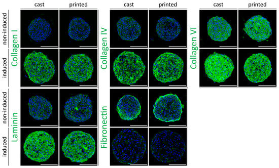The development of a tissue-specific ECM is considered an important feature in 3D tissue constructs, especially for use in in vitro model systems, since, in addition to providing physical support, the ECM actively contributes to the behavior of the cells and the complex interaction with their environment [51]. We have recently shown that ECM composition in ASC spheroids that were adipogenically differentiated in culture plates closely resembled the ECM pattern in native adipose tissue [13]. As the encapsulation of the spheroids in the hydrogel and the printing process may affect ECM development, we evaluated the ECM deposition in printed versus cast spheroids. Furthermore, adipogenically differentiated spheroids were compared to non-induced controls. Constructs were stained immunohistochemically for the major ECM components collagen I, collagen IV, collagen VI, laminin, and fibronectin (Figure 5).