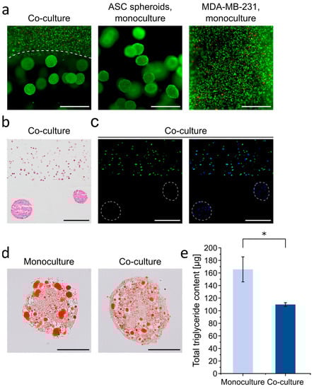 For co-culture experiments, hydrogels containing MDA-MB-231 breast cancer cells (ATCC, Manassas, VA, USA) were printed on top of the ASC-laden constructs after 21 days of adipogenic culture. MDA-MB-231 breast cancer cells were expanded in growth medium composed of DMEM (1 g/L glucose, Life Technologies) supplemented with 10% FBS, 1% L-glutamine, 1% MEM non-essential amino acids solution, 1% sodium pyruvate, 0.6% HEPES, and 1% penicillin/streptomycin (all Life Technologies). After harvesting, MDA-MB-231 cells at passage 6 were suspended in hyaluronic acid-based hydrogel precursor solution and printed at 1 bar as described above. Before transferring the suspension into the glass rings for UV irradiation (see above), differentiated ASC spheroid-laden hydrogels were put at the bottom inside the glass ring. The hydrogel–cancer cell suspension was then dispensed on top and UV-crosslinked at 365 nm for 10 min. The resulting co-culture hydrogels (bottom: adipogenically differentiated ASC spheroids, top: MDA-MB-231 cells) were cultured for 9 days in maintenance medium consisting of DMEM/F12, 10% fetal bovine serum, 1.7 µM insulin, and 1% penicillin/streptomycin. Samples were harvested at d0 and d9. Double gels with either empty top or bottom compartment (only ASC spheroids at the bottom or only MDA-MB-231 at the top) served as monoculture controls.