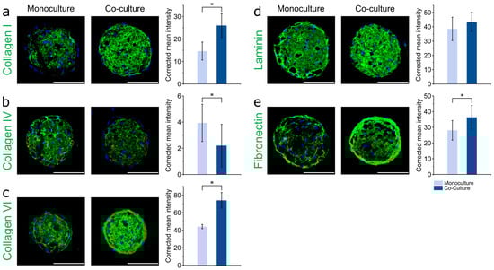 ECM deposition in adipose spheroids within the printed 3D co-culture model. ASC spheroids were printed in HA-SH/P(AGE-co-G) hydrogels, followed by adipogenic differentiation for 21 days. Subsequently, MDA-MB-231 cells were printed on the adipose constructs using the same gel formulation, and co-culture was performed for 9 days. Immunofluorescence staining of (a) collagen I, (b) collagen IV, (c) collagen VI, (d) laminin and (e) fibronectin, and quantification of the respective fluorescence intensities. Nuclei were counterstained with DAPI (blue). ASC spheroids in monoculture and co-culture on day 9 of the experiment are compared. Representative images are shown. Scale bars represent 100 µm. Data are presented as mean ± standard deviation (n = 10). Statistically significant differences are indicated by * (p < 0.05).