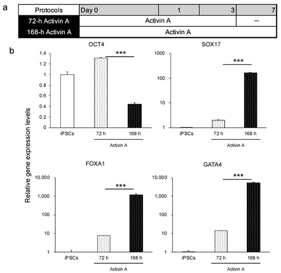 Comparison of duration of activin A treatment (72 and 168 h) on the differentiation of the iPSC line Windy (feeder-free) into the endoderm. (a) Human iPSC-derived endoderm differentiation protocols, namely 72 h activin A and 168 h activin A. (b) Relative gene expression levels of OCT4, SOX17, FOXA1, and GATA4. Human iPSCs = 1. Results are presented as means ± S.D. (n = 3). Levels of statistical significance: *** p < 0.001.
