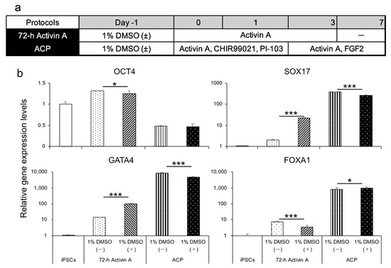 A comparison of differentiated endoderm on the pretreatment or absence of 1% DMSO using 72 h activin A and ACP protocols. (a) Human iPSC-derived endoderm differentiation method using 72 h activin A and ACP protocols in the presence or absence of 1% DMSO. (b) Relative gene expression levels of undifferentiated cell markers and endodermal markers in the human iPSC line Windy-derived endoderm using 72 h activin A and ACP protocols with or without pretreatment with 1% DMSO. Results are presented as means ± S.D. (n = 3). Human iPSCs = 1. Levels of statistical significance: * p < 0.05, *** p < 0.001.