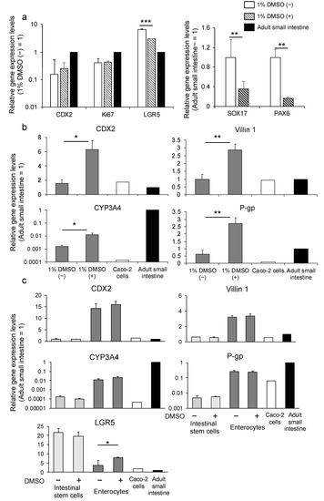 We differentiated the endoderm toward small intestinal stem cells and enterocytes using the protocol we reported [27]. We evaluated gene expression levels in the small intestinal stem cells generated from the K-derived endoderm. We found that cells in the 1% DMSO pretreatment group (1% DMSO (+) group) showed a higher expression level of caudal-type homeobox 2 (CDX2), which is a hindgut marker [35], lower expression levels of SOX17 and paired box protein Pax−6 (PAX6), which is a neuroectoderm marker [36], and almost the same expression level of Ki67, which is a proliferation marker, compared with those of the group without 1% DMSO pretreatment (1% DMSO (–) group) (Figure 4a). Although the leucine-rich repeat-containing G protein-coupled receptor 5 (LGR5) expression level was suppressed in the 1% DMSO (+) group compared with the 1% DMSO (−) group, it was higher than that of the human adult small intestine (Figure 4a). To identify the effect of 1% DMSO on further differentiation, we induced small intestinal stem cells to differentiate into enterocytes according to the protocol we reported [27]. Gene expression levels of CDX2 and villin 1 (enterocyte-related markers), CYP3A4 (drug-metabolizing enzyme), and P-gp (drug transporter) were significantly higher in the 1% DMSO (+) group compared with that in the 1% DMSO (−) group (Figure 4b). Thus, we verified the effectiveness of DMSO pretreatment for differentiation into endoderm using cell line K. Moreover, we used another human iPSC line Windy to evaluate the ability of DMSO in endoderm to differentiate into enterocytes. Differentiated enterocytes showed higher or similar levels of LGR5, CDX2, and villin 1 and lower levels of P-gp and CYP3A4 expression, compared to the human adult small intestine. Although CYP3A4 expression level remained lower than that of human adult intestine, it was 450 times higher than that in Caco−2 cells. However, excluding LGR5, 1% DMSO pretreatment did not significantly influence target gene expression levels between differentiated cells and Windy (Figure 4c).