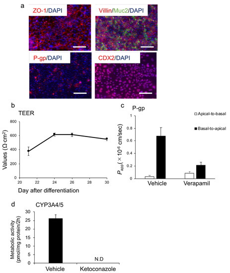 We further investigated the characteristics of enterocytes differentiated from HiEnd using the ACP protocol (ACP–enterocyte) using the Windy cell line. Protein expression of ZO−1 (tight junction marker) [37], villin, CDX2, Mucin 2 (goblet cell marker), and P-gp were confirmed in enterocytes using immunofluorescence staining (Figure 5a). The transepithelial electrical resistance (TEER) value, which is an index of the robustness of tight junctions, was measured from days 21 of differentiation to the end of differentiation. TEER values were stably maintained at 500–600 Ω·cm2 from days 24 to the end of differentiation (Figure 5b). Then, we analyzed the ability of the efflux transporter P-gp using rhodamine 123 as the substrate. The Papp values were 0.04 ± 0.02 and 0.09 ± 0.03 (×10−6 cm/s) in the absence and presence of verapamil, a specific P-gp inhibitor, respectively. Moreover, the basal-to-apical Papp values were 0.68 ± 0.13 and 0.21 ± 0.05 (×10−6 cm/s) in the absence and presence of verapamil, respectively. The ER in the vehicle group was 18.4, which decreased to 2.4 in the presence of verapamil (Figure 5c). We also quantified 1′-hydroxylmidazolam, which is a major metabolite of midazolam, to evaluate CYP3A4/5 activity and found that the cells possessed CYP3A4/5 activity. In the presence of ketoconazole, an inhibitor of CYP3A4/5, the activity was markedly suppressed (Figure 5d). According to the abovementioned results, we considered that the human iPSC-derived endoderm cells obtained using the ACP protocol exhibited the ability to differentiate into enterocytes.