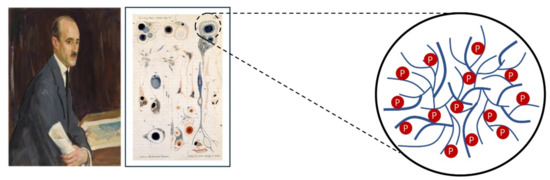 In 1911, the Spanish neurologist Dr. Gonzalo Rodriguez Lafora described polyglucosan bodies in the perikaryon of neurons in the cerebral cortex, thalamus, globus pallidus, and substantia nigra of affected patients. Lafora bodies are the result of the aggregation of long, unbranched, hyperphosphorylated and insoluble forms of glycogen. The left panel shows a painting of Dr. Lafora displayed at Prado Museum (Madrid). The middle panel shows a copy of the original paintings of neurons from affected patients. The right panel shows a cartoon of the hyperphosphorylated aberrant glycogen present in Lafora bodies.