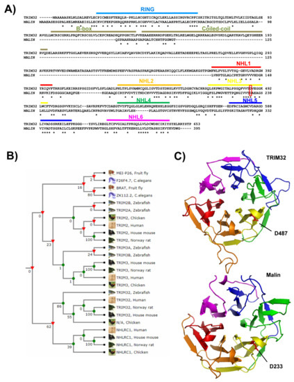 Structural data of TRIM32 and malin. (A) Protein sequence similarity between TRIM32 and malin. The position of the RING domain (in blue), the B-box and coiled-coil domains (in grey), and the six NHL domains (in red, orange, yellow, green, dark blue, and magenta) are indicated; the position of the residues D487 and D233 is also indicated in a red box; protein sequence alignment was performed using CLUSTAL-W (https://www.expasy.org/resources/clustalw, accessed on 1 January 2021). Identical amino acids are indicated with an asterisk at the bottom of the sequence. (B) Phylogenetic relationship between TRIM32 and malin (NHLRC1) using TreeFam from EMBL-EBI. (C) Modelling of the C-terminal domain of TRIM32 and malin using the Swiss-Model homology modeling software (http://swissmodel.expasy.org, accessed on 1 January 2021) and the crystal structure of the C-terminal domain of Danio rerio TRIM71 (PDB 6FPT) as a model. Disease-related residues D487 in TRIM32 and D233 in malin are located in an analogous position.