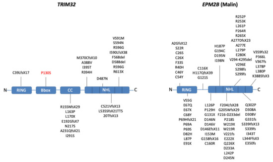 Additional indications on residues/domains relevant for the activity of the two proteins can be gathered from the many pathological mutations occurring in EPM2B (malin) and in TRIM32, graphically summarized in Figure 4. Most of the LGMDR8-causing mutations are clustered within the C-terminal NHL domain, whereas the LD-causing mutations in EPM2B are more homogeneously distributed along the malin protein (Figure 4).