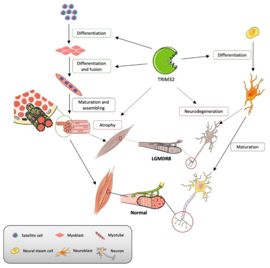 Limb-girdle muscular dystrophy R8 (LGMDR8) and the role of TRIM32 in the context of muscle and neuronal differentiation/degeneration. The activated satellite cells differentiate into myoblasts and then fuse together to form myotubes. The myotubes further mature and assemble into myofibers. The neural stem cells are activated and differentiate into neuroblasts, then further mature into neurons. TRIM32 is involved in these physiological processes through regulating differentiation and fusion (green boxes). Dysfunction of TRIM32 will disrupt normal neuromuscular system growth and possibly induce atrophy and neurodegeneration, which causes the occurrence of LGMDR8 (red boxes).