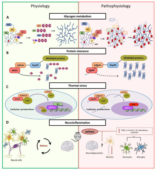 Physiological and pathophysiological processes related to malin. Panel (A), physiological negative regulation of glycogen synthesis through the cooperation of laforin and malin. On the right, formation of hyperphosphorylated glycogen as a consequence of the increase in the levels of PTG, GS, and laforin. Panel (B), misfolded protein clearance or aggregation depending on the functional synergy between malin and laforin. Panel (C), formation of the ternary laforin–malin–CHIP complex to cope with thermal stress through the transcriptional activation of HSF1. Panel (D), mouse animal models for LD show the reduced viability of neurons and elevated levels of pro-inflammatory mediators triggered by astrocytes and microglia.