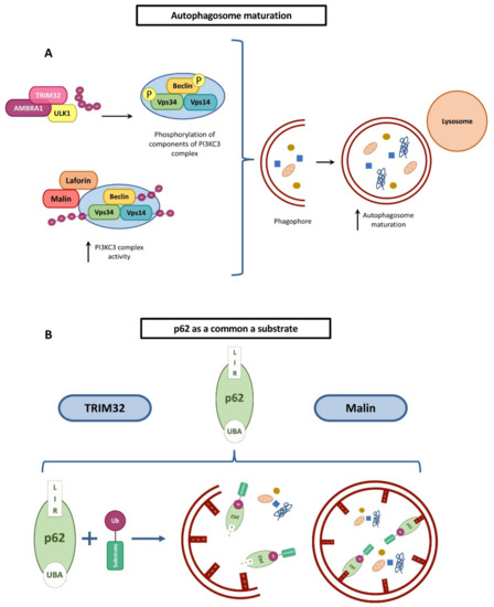 One of the pathways regulated by both malin and TRIM32 is autophagy, which indeed involves several TRIM family members [82]. Evidence reports that both malin and TRIM32 are positive regulators through the ubiquitination of different components of the autophagy pathway, including phosphatidylinositol 3-kinase catalytic subunit type 3 (PI3KC3) complex and p62.