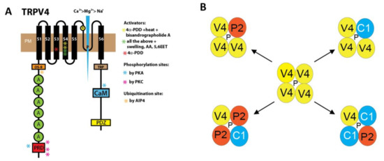 - Fan, H.C.; Zhang, X.; McNaughton, P.A. Activation of the TRPV4 ion channel is enhanced by phosphorylation. J. Biol. Chem. 2009, 284, 27884–27891. [Google Scholar] [CrossRef]