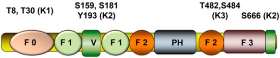 The eight phosphorylation sites in kindlins depicted in Figure 1 have been assigned specific functions, and we discuss these briefly below. In K1, a particular function has been assigned to T8 and T30 within the F0 subdomain in the regulation of mitotic spindles []. Orientation of mitotic spindles is known to be regulated by β1-integrins, and disruption of K1 mimics the effect of the β1-integrin depletion on spindle phenotype. K1 is exclusively phosphorylated by Plk1 at centrosomes. While K1 phosphorylation of T8 and T30 is pivotal for normal spindle formation, these PTM are not required for integrin activation as demonstrated using a phosphorylation resistant K1T8T30/AA mutant. K2 has also been shown to control mitotic spindle assembly through a mechanism distinct from that of K1 and depends on α-tubulin acetylation, AKT serine/threonine kinase or paxillin [].