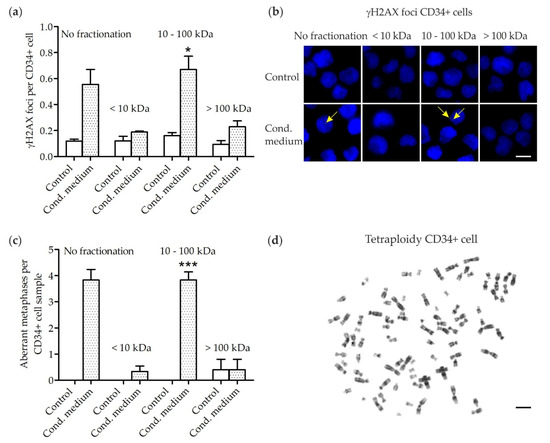 Immunofluorescence microscopy of γH2AX foci, which are a marker of DSB, is widely used in RIBE analysis [32,33,34]. Increased numbers of γH2AX foci were detected in CD34+ cells grown in the (II) 10–100 kDa fraction of MSC conditioned medium when compared to low numbers of γH2AX foci in CD34+ cells grown in (I) < 10 kDa and (III) > 100 kDa fractions of MSC conditioned medium or in un-/fractionated control medium. Our data are in line with similarly increased numbers of chtb detected in CD34+ cells grown in the (II) 10–100 kDa fraction of MSC conditioned medium. Importantly, chtb may activate oncogenes or inactivate tumor suppressor genes, thus providing a potential mechanistic link to the initiation of MN.